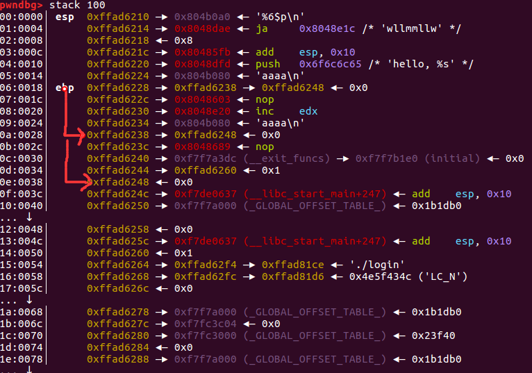 我们能看到栈上ebp的指针指向上一个ebp。上一个ebp指向上上个ebp。我们前面是不是说过只要有地址,我们就能往这个地址上写任意的值。